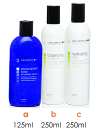 Using the Color Defence mixing guide, the colour technician fills either a 125ml or 200ml prescription bottle with a blend of Color Defence shampoo or conditioner to match the client's salon colour. The prescription is then recorded onto the client's colour chart for future reference, along with the recommended moisturising option a, b or c.
